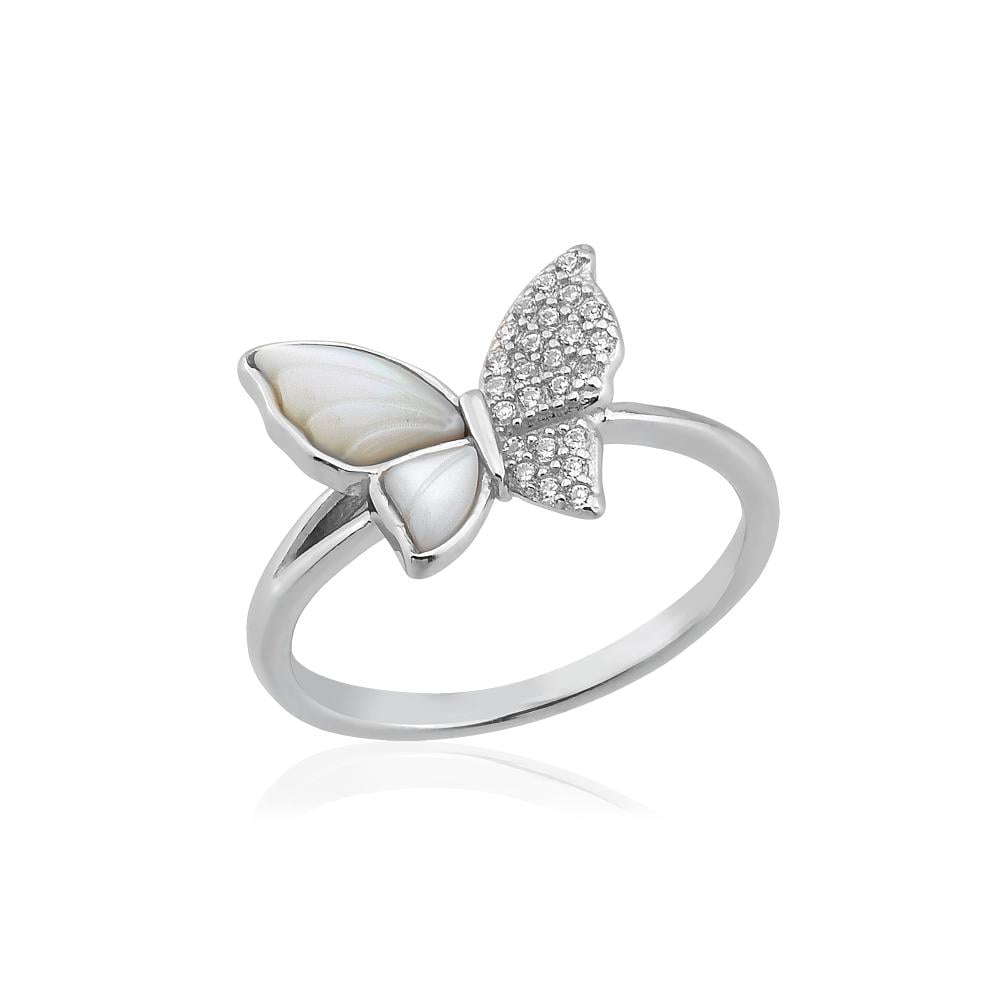 جناحا الفراشة مزينان بأحجار زركون صغيرة لامعة تضيف لمسة من البريق والأنوثة، بينما ينحني الهيكل الفضي بانسيابية حول الإصبع ليعانق اليد بأناقة.